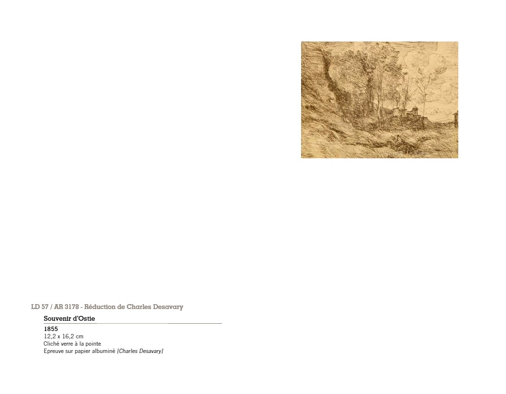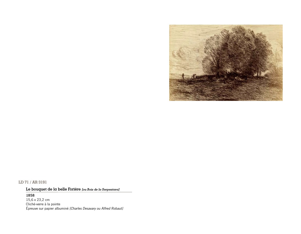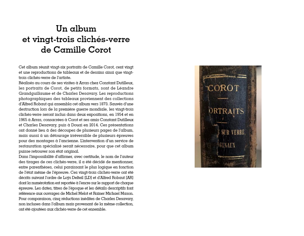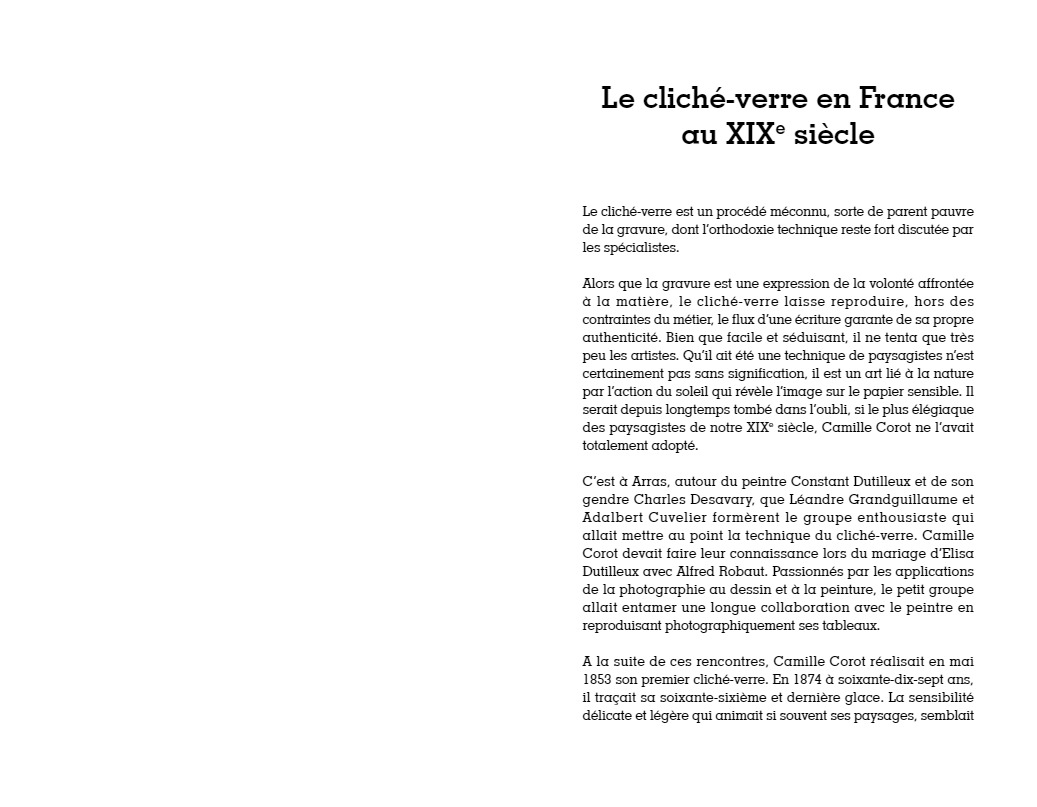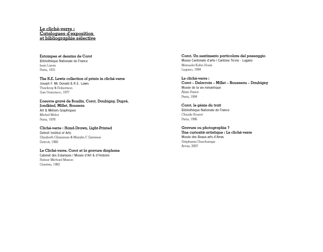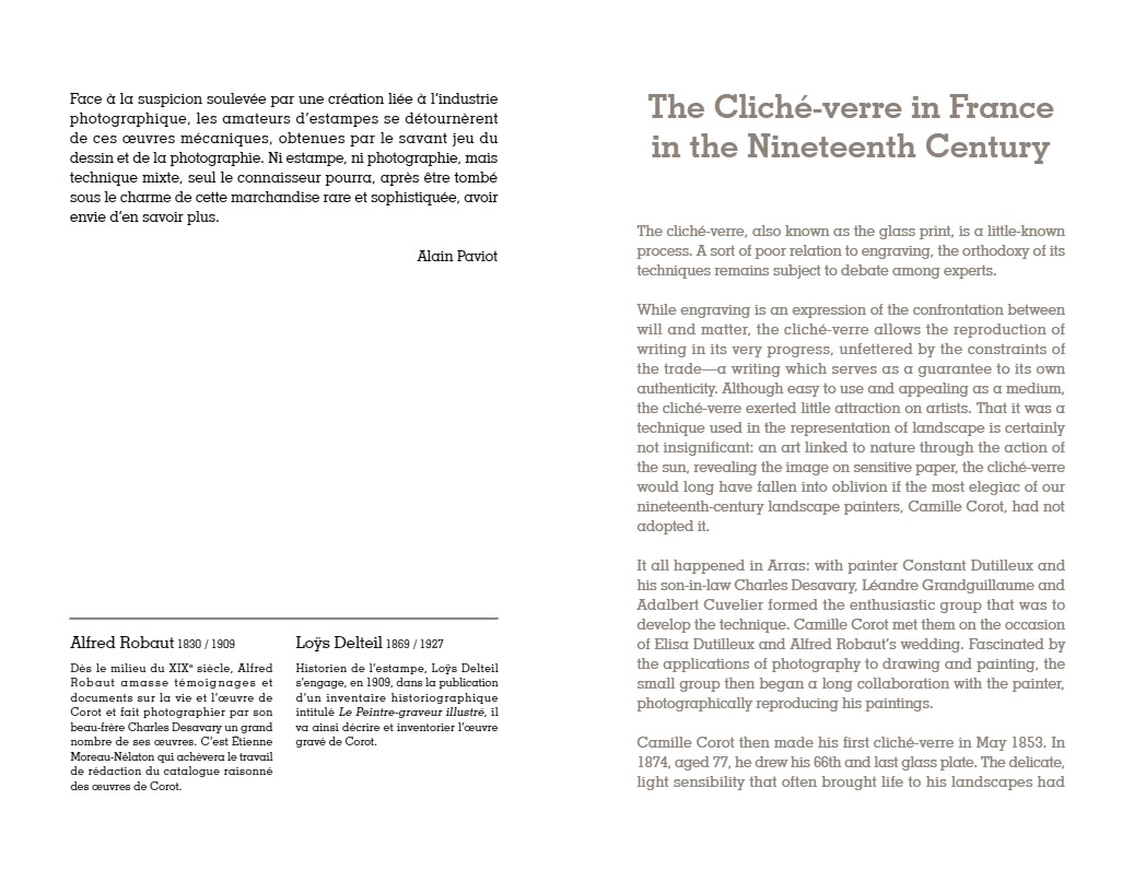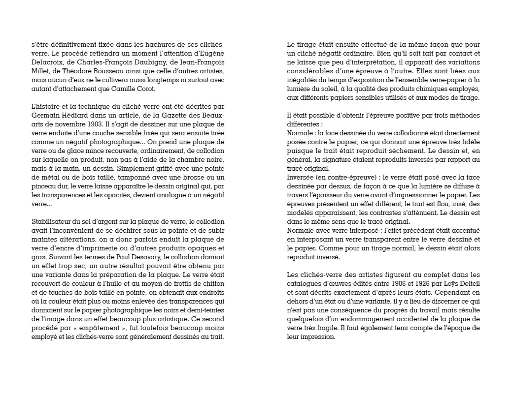 “C’est à Arras, autour du peintre Constant Dutilleux et de son gendre Charles Desavary, que Léandre Grandguillaume et Adalbert Cuvelier formèrent le groupe enthousiaste qui allait mettre au point la technique du cliché-verre… À la suite de ces rencontres, Camille Corot réalisait en mai 1853 le premier cliché-verre de l’école de Barbizon. En 1874 à soixante-dix-sept ans, il traçait sa soixante-sixième et dernière glace. La sensibilité délicate et légère qui animait si souvent ses paysages, semblait s’être définitivement fixée dans les hachures de ses clichés-verre…”