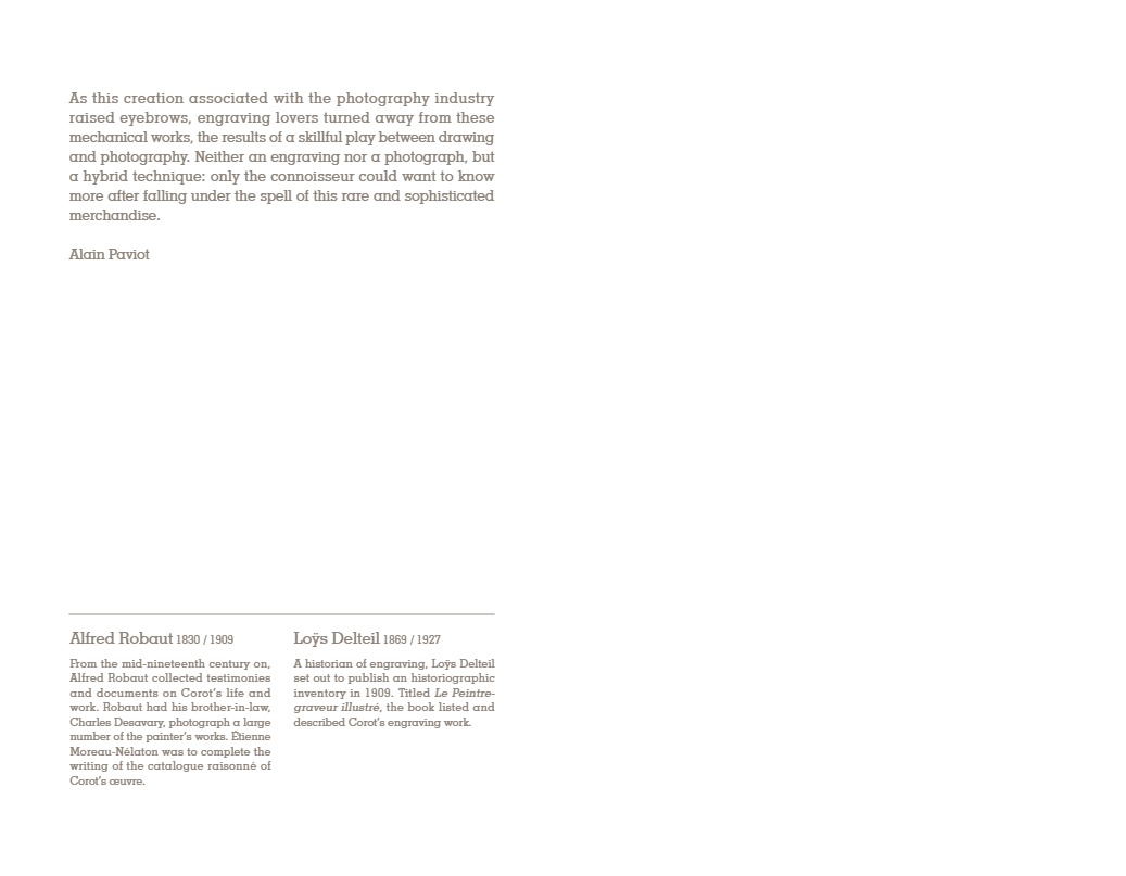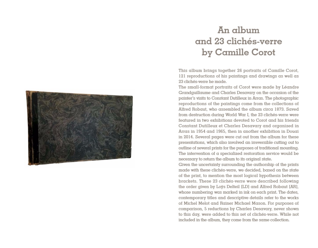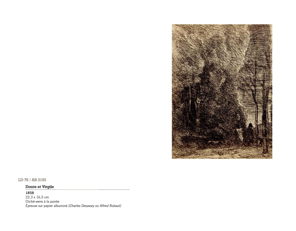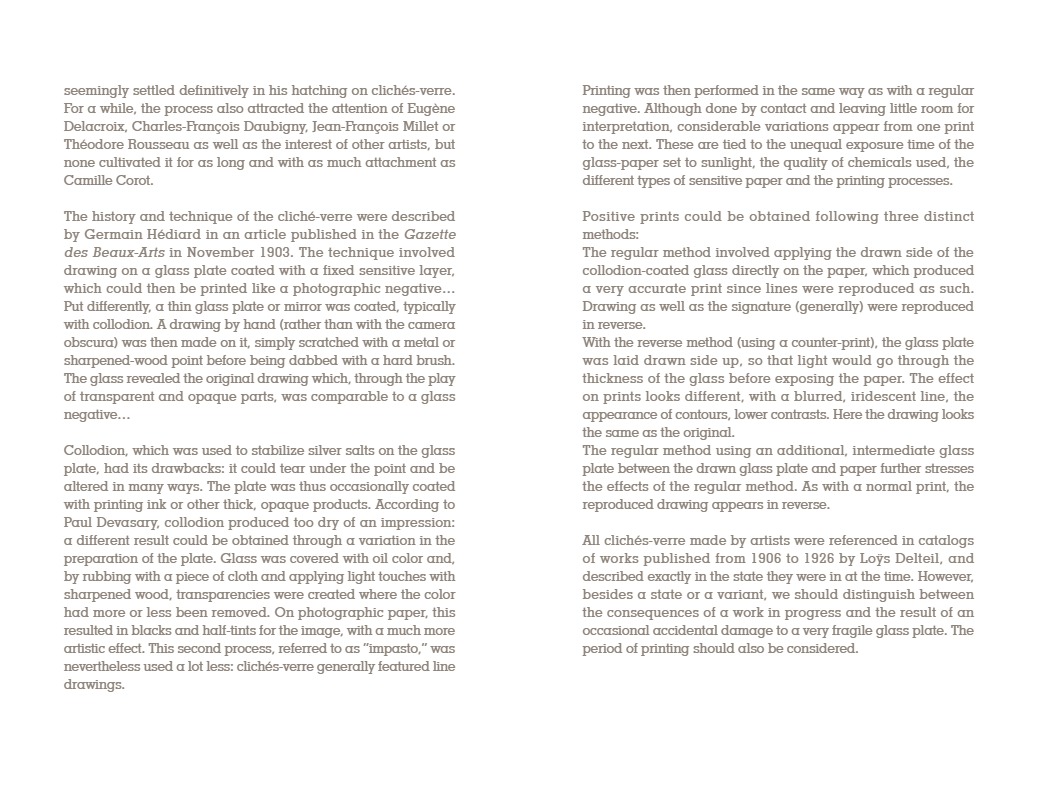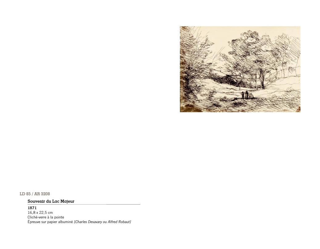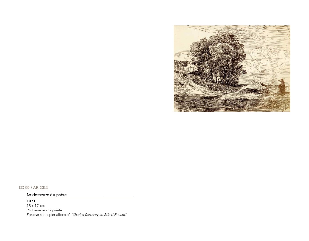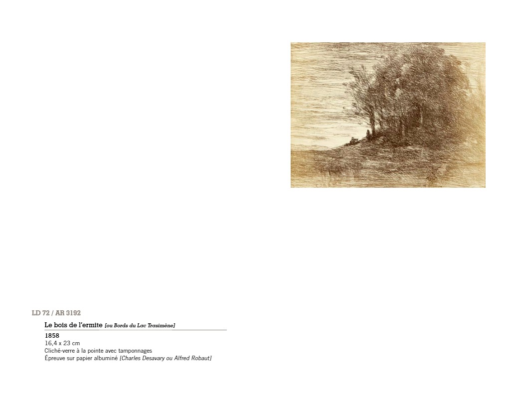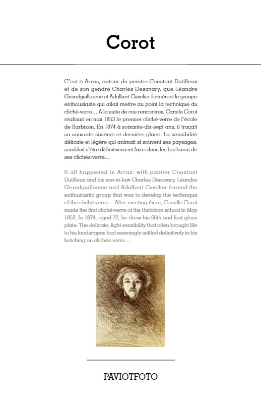 “C’est à Arras, autour du peintre Constant Dutilleux et de son gendre Charles Desavary, que Léandre Grandguillaume et Adalbert Cuvelier formèrent le groupe enthousiaste qui allait mettre au point la technique du cliché-verre… À la suite de ces rencontres, Camille Corot réalisait en mai 1853 le premier cliché-verre de l’école de Barbizon. En 1874 à soixante-dix-sept ans, il traçait sa soixante-sixième et dernière glace. La sensibilité délicate et légère qui animait si souvent ses paysages, semblait s’être définitivement fixée dans les hachures de ses clichés-verre…”