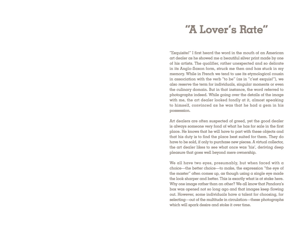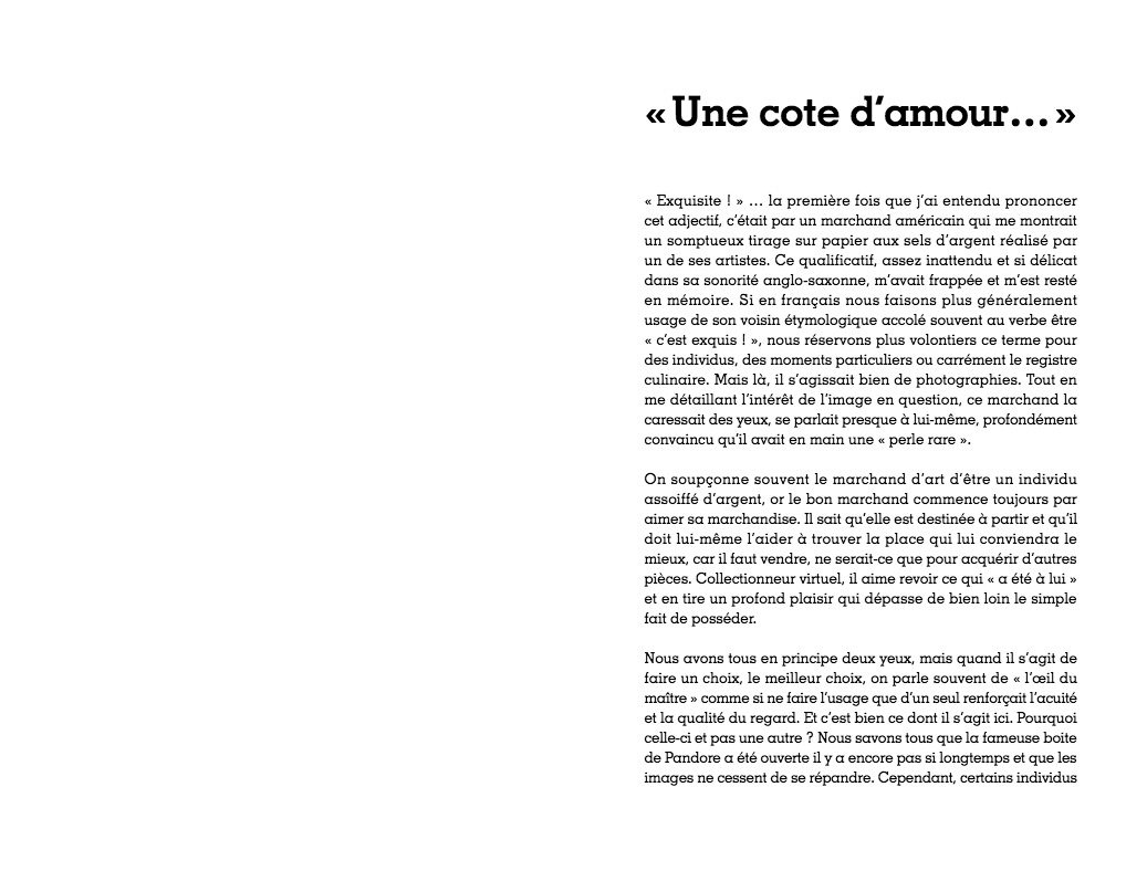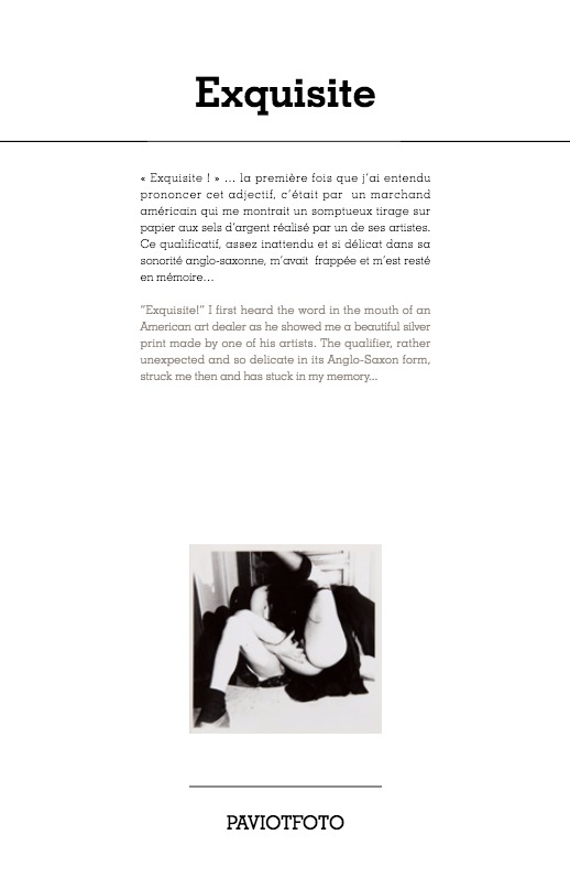 « Exquisite ! » … la première fois que j’ai entendu prononcer cet adjectif, c’était par un marchand américain qui me montrait un somptueux tirage sur papier aux sels d’argent réalisé par un de ses artistes. Ce qualificatif, assez inattendu et si délicat dans sa sonorité anglo-saxonne, m’avait frappée et m’est resté en mémoire. Si en français nous faisons plus généralement usage de son voisin étymologique accolé souvent au verbe être « c’est exquis ! », nous réservons plus volontiers ce terme pour des individus, des moments particuliers ou carrément le registre culinaire. Mais là, il s’agissait bien de photographies. Tout en me détaillant l’intérêt de l’image en question, ce marchand la caressait des yeux, se parlait presque à lui-même, profondément convaincu qu’il avait en main une « perle rare ».